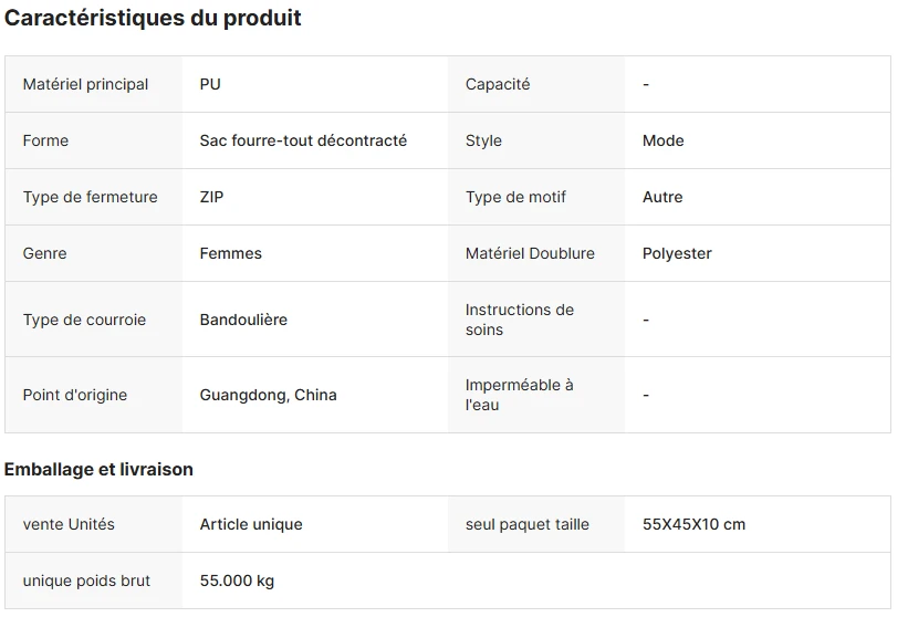 Caractéristiques du produitMatériel principal PU Capacité - Forme Sac fourre-tout décontracté Style Mode Type de fermeture ZIP Type de motif Autre Genre Femmes 0/5